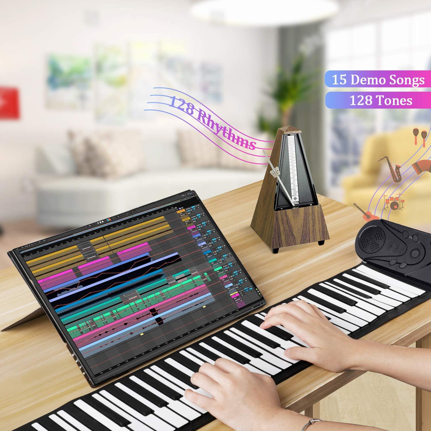 It is convenient to carry it with you, anytime, anywhere to play the piano- The piano can be rolled. built-in stereo speakers, travel, outdoor, at home, at school, you can play in any places you like. You can connect an external headset while playing so as not to disturb others and enjoy music anytime and anywhere.